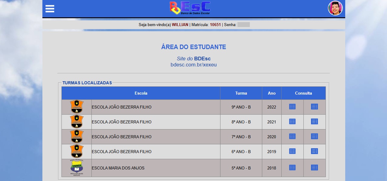 A senha criada pelo sistema é a mesma para acessar todos os anos enquanto o estudante estiver matriculado no município, criando na sua área um histórico de notas com botão para download dos dados.