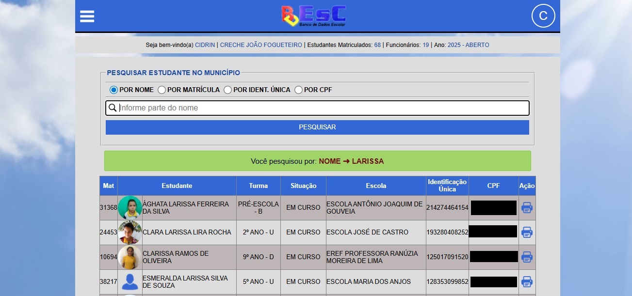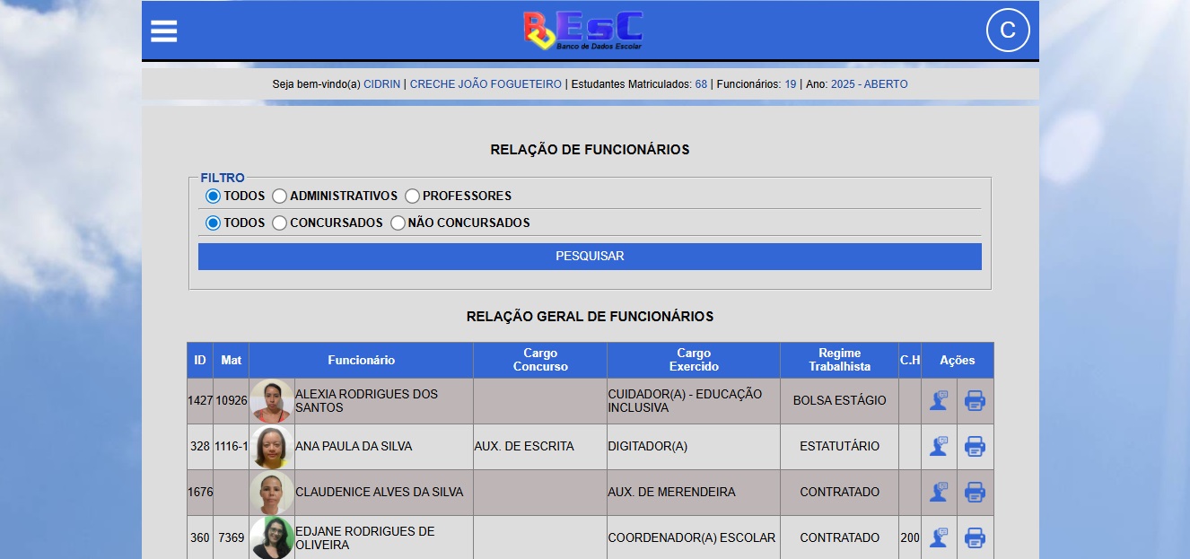 Nessa área todas as escolas do município podem acessar o sistema e cadastrar os estudantes e funcionários. Após cadastramento vários relatórios são disponibilizados automaticamente pelo sistema.
