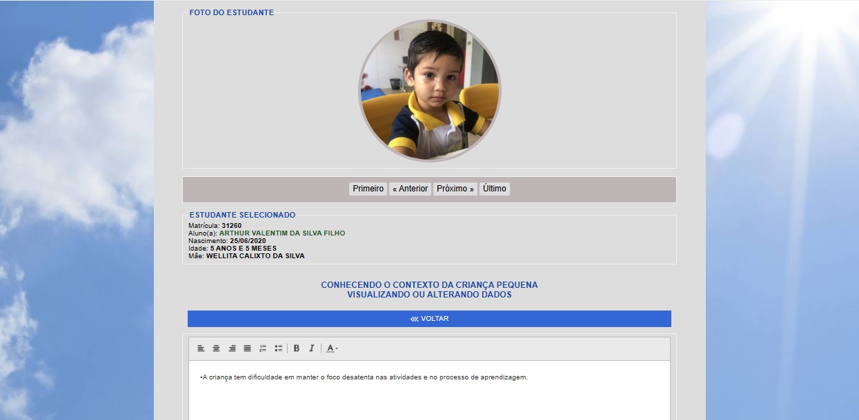 A senha criada pelo sistema é a mesma para acessar todos os anos enquanto o estudante estiver matriculado no município, criando na sua área um histórico de notas com botão para download dos dados.